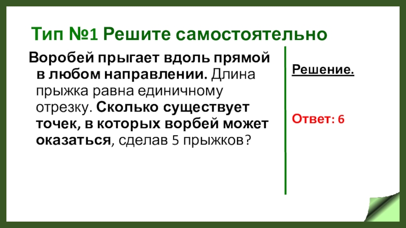 равна единичному отрезку. Сколько существует точек, в которых ворбей может оказаться, сделав 5 прыжков?