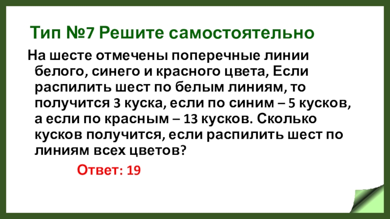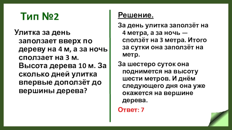 а за ночь сползает на 3 м. Высота дерева 10 м. За сколько дней улитка впервые доползёт до вершины дерева?