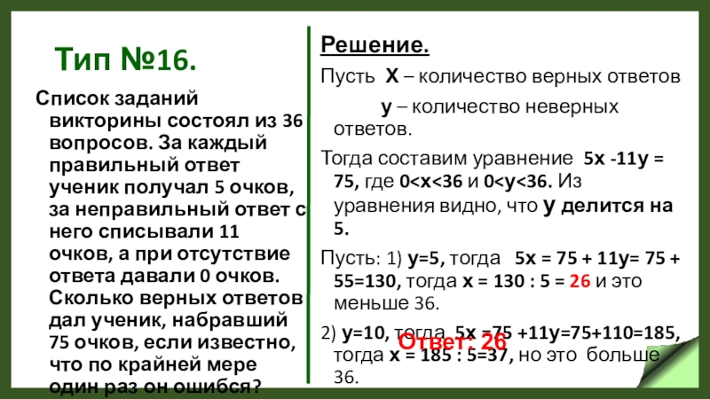 ответ ученик получал 5 очков, за неправильный ответ с него списывали 11 очков, а при отсутствие ответа давали 0 очков. Сколько верных ответов дал ученик, набравший 75 очков, если известно, что по крайней мере один раз он ошибся?