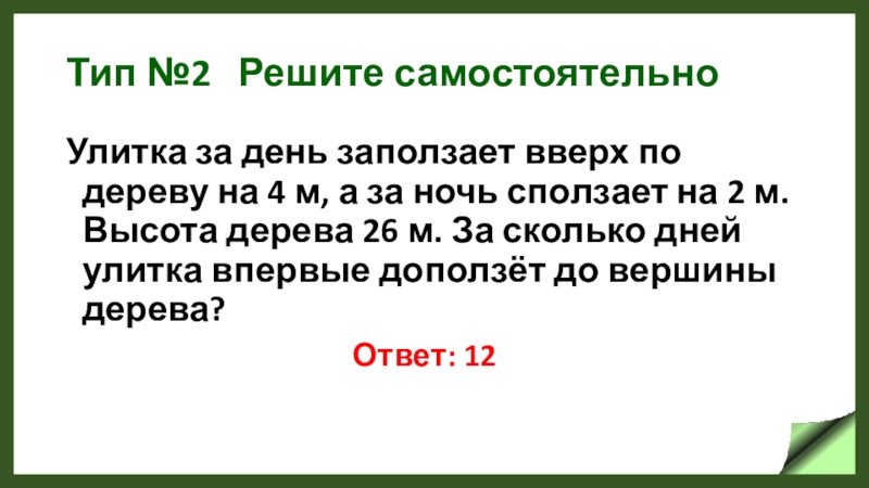 на 4 м, а за ночь сползает на 2 м. Высота дерева 26 м. За сколько дней улитка впервые доползёт до вершины дерева?