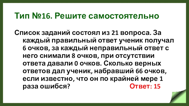 каждый правильный ответ ученик получал 6 очков, за каждый неправильный ответ с него снимали 8 очков, при отсутствии ответа давали 0 очков. Сколько верных ответов дал ученик, набравший 66 очков, если известно, что он по крайней мере 1 раза ошибся? Ответ: 15