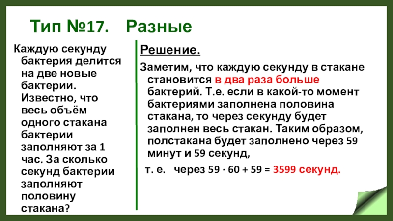 Известно, что весь объём одного стакана бактерии заполняют за 1 час. За сколько секунд бактерии заполняют половину стакана?