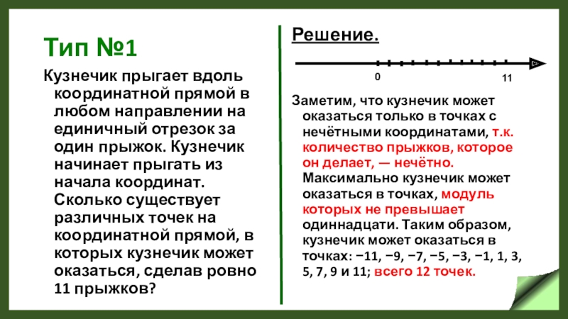 Заметим, что кузнечик может оказаться только в точках с нечётными координатами, т.к. количество прыжков, которое он делает, — нечётно. Максимально кузнечик может оказаться в точках, модуль которых не превышает одиннадцати. Таким образом, кузнечик может оказаться в точках: −11, −9, −7, −5, −3, −1, 1, 3, 5, 7, 9 и 11; всего 12 точек.