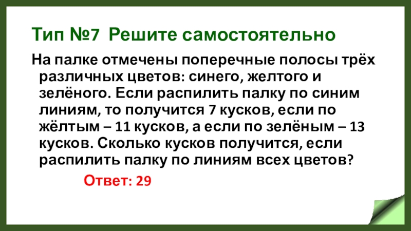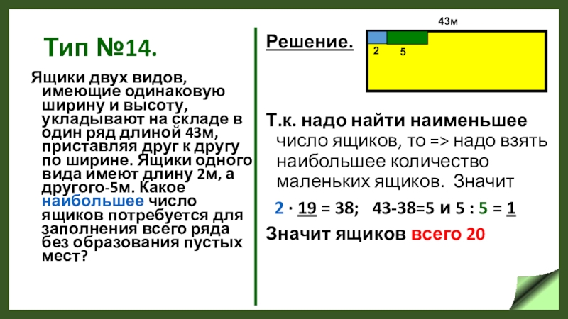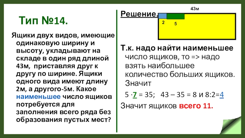 складе в один ряд длиной 43м, приставляя друг к другу по ширине. Ящики одного вида имеют длину 2м, а другого-5м. Какое наименьшее число ящиков потребуется для заполнения всего ряда без образования пустых мест?