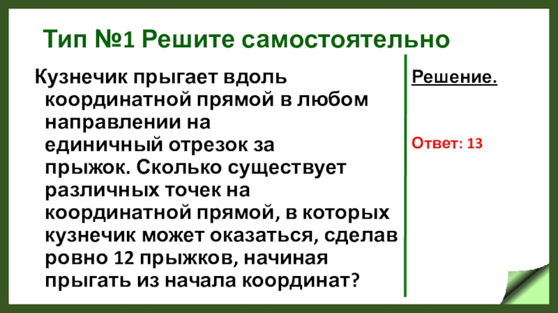 на единичный отрезок за прыжок. Сколько существует различных точек на координатной прямой, в которых кузнечик может оказаться, сделав ровно 12 прыжков, начиная прыгать из начала координат?