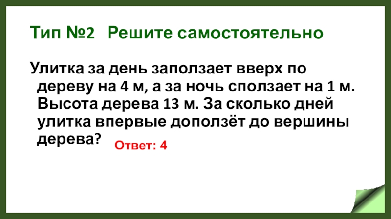 на 4 м, а за ночь сползает на 1 м. Высота дерева 13 м. За сколько дней улитка впервые доползёт до вершины дерева?