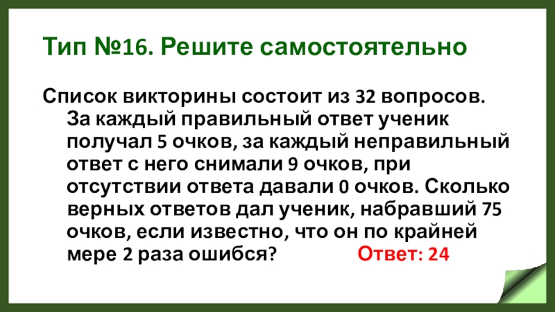 каждый правильный ответ ученик получал 5 очков, за каждый неправильный ответ с него снимали 9 очков, при отсутствии ответа давали 0 очков. Сколько верных ответов дал ученик, набравший 75 очков, если известно, что он по крайней мере 2 раза ошибся? Ответ: 24