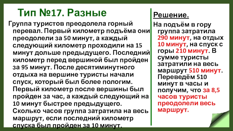 На подъём в гору группа затратила 290 минут, на отдых 10 минут, на спуск с горы 210 минут. В сумме туристы затратили на весь маршрут 510 минут. Переведём 510 минут в часы и получим, что за 8,5 часов туристы преодолели весь маршрут.