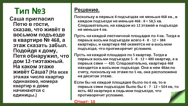 подъезде в квартире № 468, а этаж сказать забыл. Подойдя к дому, Петя обнаружил, что дом 12-тиэтажный. На каком этаже живёт Саша? (На всех этажах число квартир одинаково, номера квартир в доме начинаются с единицы.)