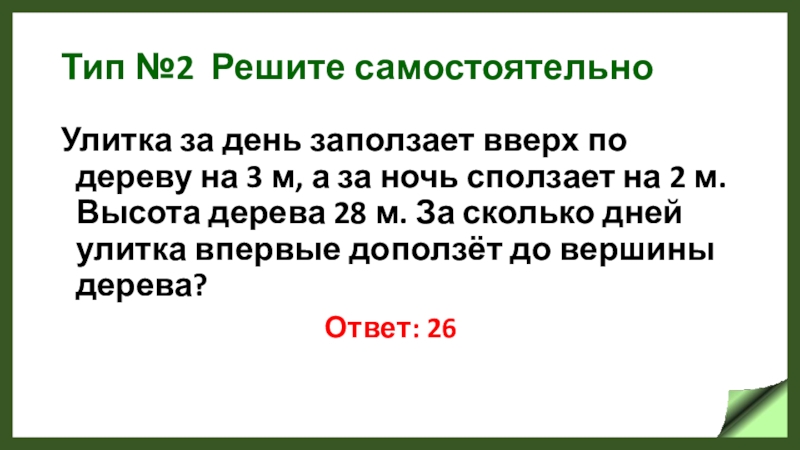 3 м, а за ночь сползает на 2 м. Высота дерева 28 м. За сколько дней улитка впервые доползёт до вершины дерева?