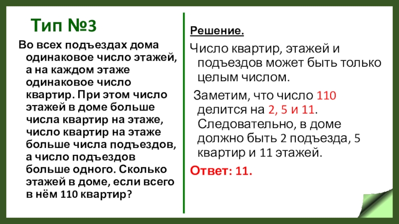 Заметим, что число 110 делится на 2, 5 и 11. Следовательно, в доме должно быть 2 подъезда, 5 квартир и 11 этажей.