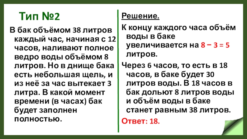 часов, наливают полное ведро воды объёмом 8 литров. Но в днище бака есть небольшая щель, и из неё за час вытекает 3 литра. В какой момент времени (в часах) бак будет заполнен полностью.