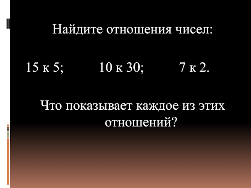 Найдите отношения чисел: 15 к 5;     10 к 30;