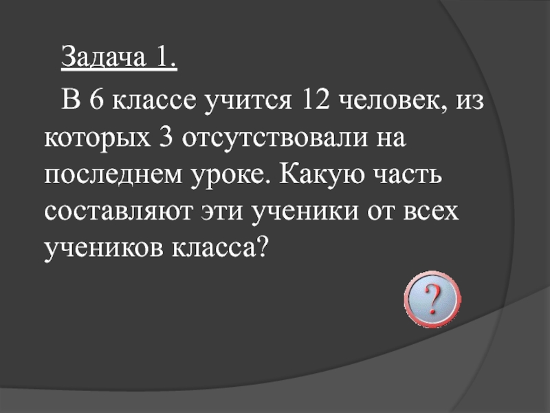 Задача 1. В 6 классе учится 12 человек, из которых 3 отсутствовали на последнем уроке. Какую часть