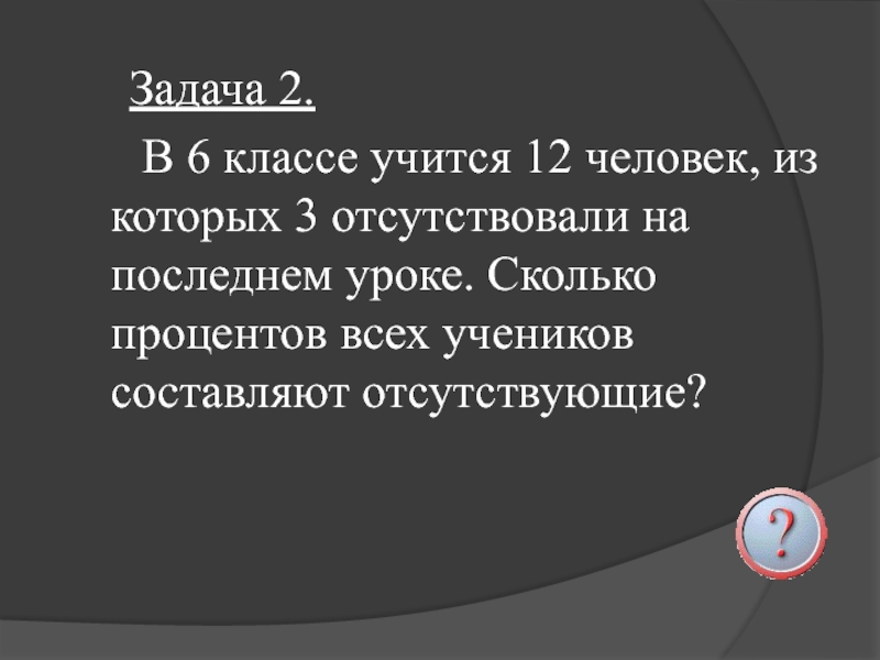 Задача 2. В 6 классе учится 12 человек, из которых 3 отсутствовали на последнем уроке. Сколько процентов