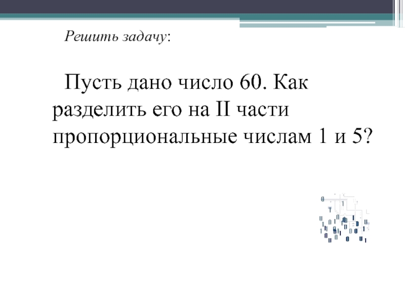 Решить задачу: Пусть дано число 60. Как разделить его на II части пропорциональные числам 1 и 5?