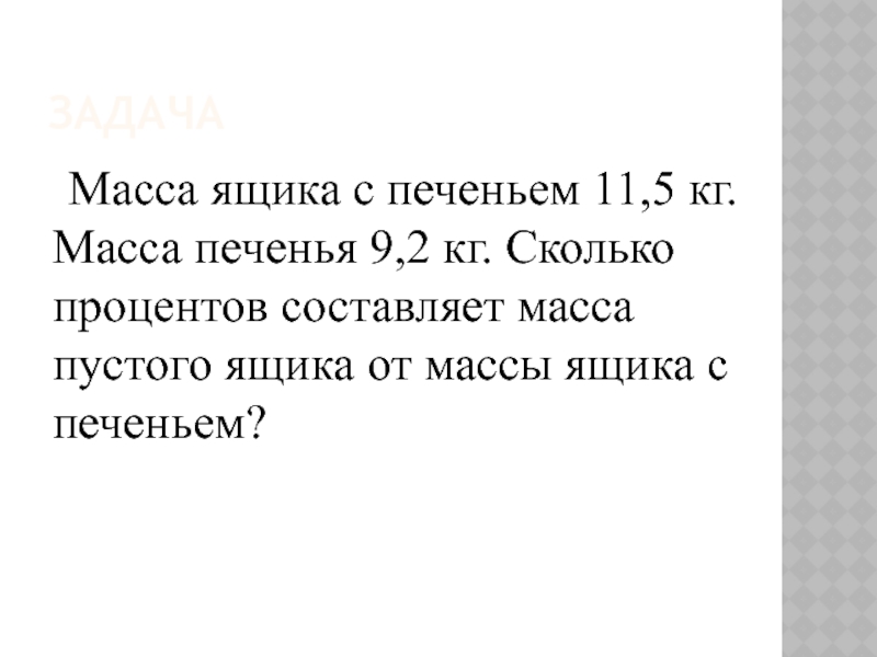ЗАДАЧА Масса ящика с печеньем 11,5 кг. Масса печенья 9,2 кг. Сколько процентов составляет масса пустого ящика