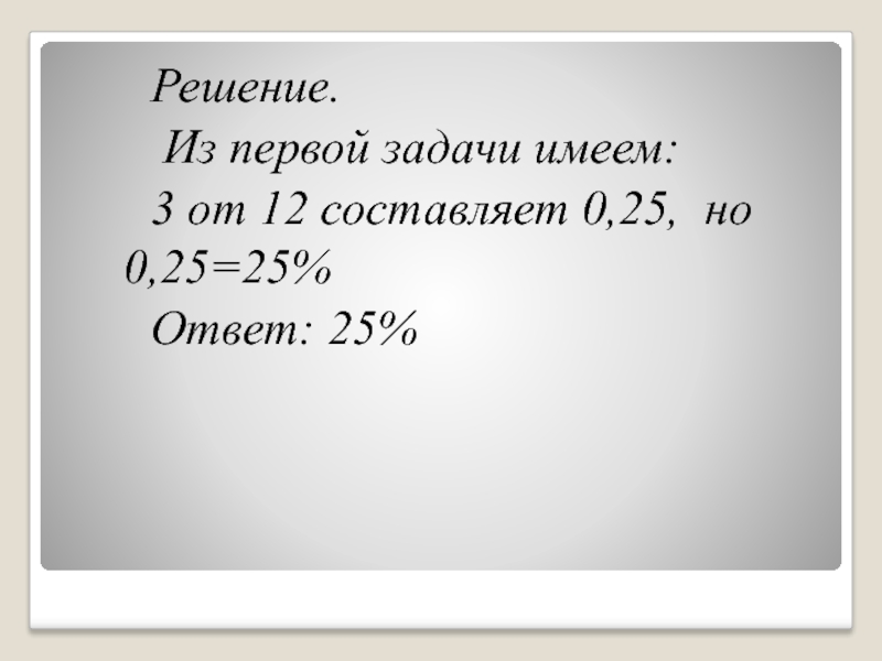 Решение. Из первой задачи имеем:3 от 12 составляет 0,25, но 0,25=25%Ответ: 25%