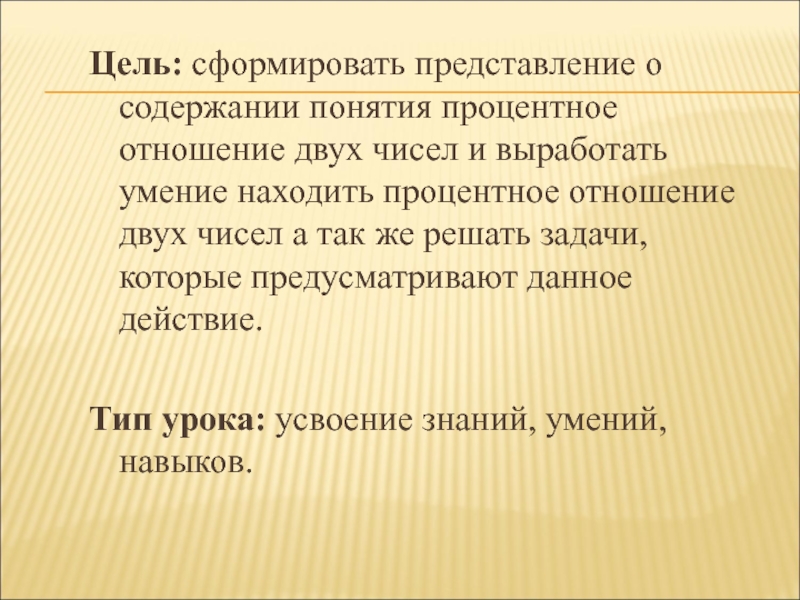 Цель: сформировать представление о содержании понятия процентное отношение двух чисел и выработать умение находить процентное отношение двух чисел а так же решать задачи, которые предусматривают данное действие.Тип урока: усвоение знаний, умений, навыков.