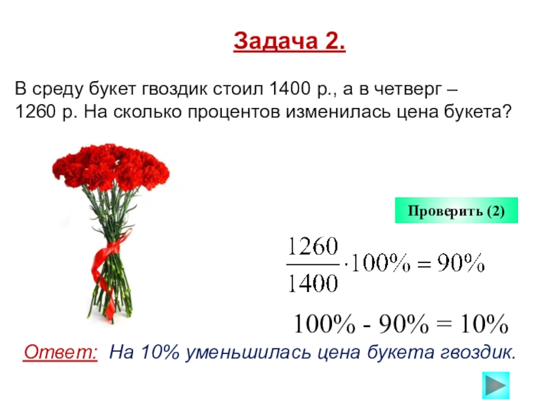 Ответ: На 10% уменьшилась цена букета гвоздик.