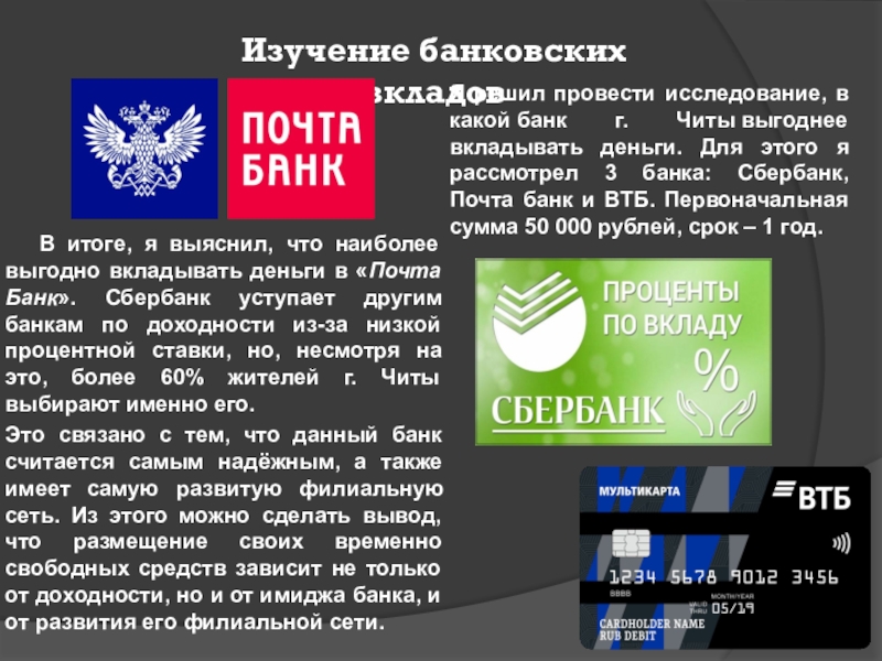 Я решил провести исследование, в какой банк г. Читы выгоднее вкладывать деньги. Для этого я рассмотрел 3 банка: Сбербанк, Почта банк и ВТБ. Первоначальная сумма 50 000 рублей, срок – 1 год.