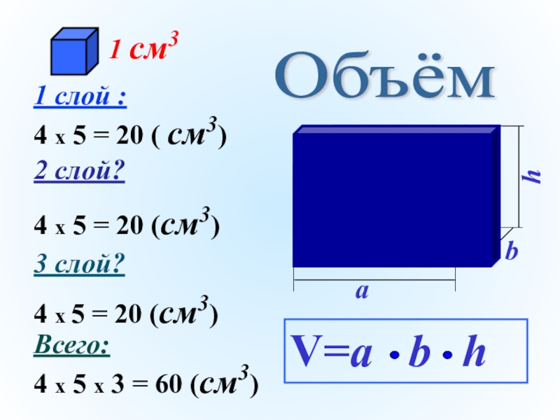 4 x 5 x 3 = 60 (см3)
