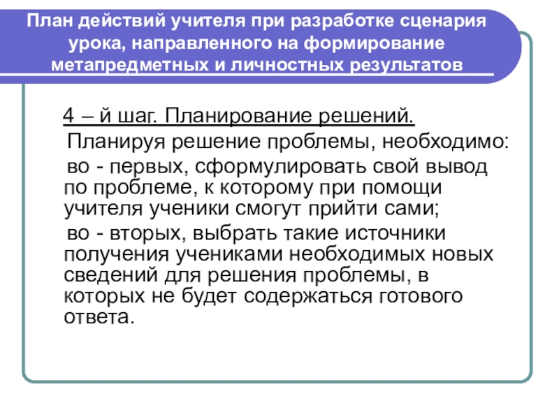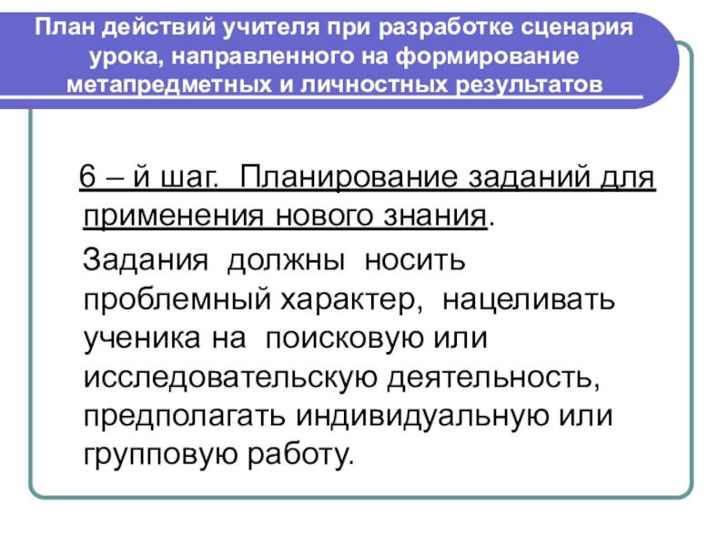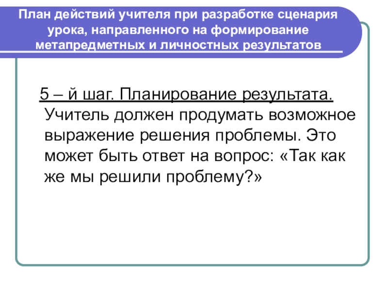 5 – й шаг. Планирование результата. Учитель должен продумать возможное выражение решения проблемы. Это может быть ответ на вопрос: «Так как же мы решили проблему?»