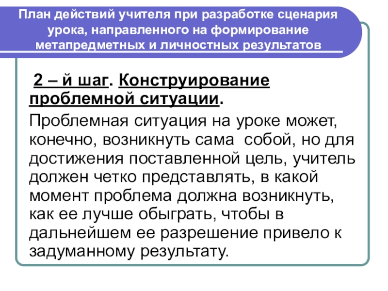 Проблемная ситуация на уроке может, конечно, возникнуть сама собой, но для достижения поставленной цель, учитель должен четко представлять, в какой момент проблема должна возникнуть, как ее лучше обыграть, чтобы в дальнейшем ее разрешение привело к задуманному результату.