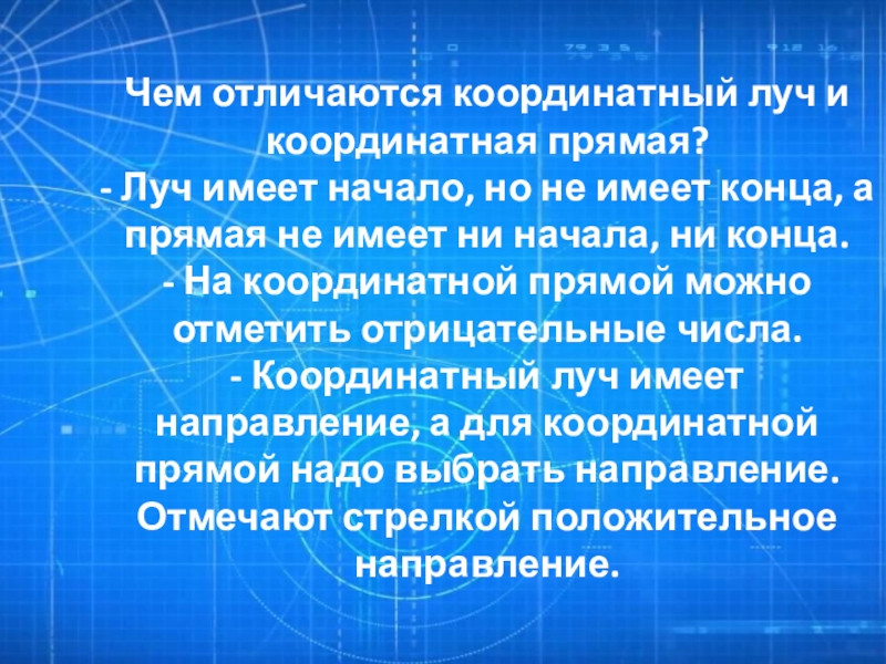 не имеет конца, а прямая не имеет ни начала, ни конца. - На координатной прямой можно отметить отрицательные числа. - Координатный луч имеет направление, а для координатной прямой надо выбрать направление. Отмечают стрелкой положительное направление.