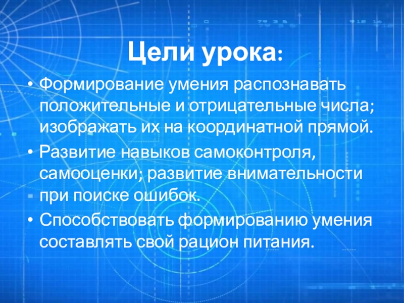 Цели урока:Формирование умения распознавать положительные и отрицательные числа; изображать их на координатной прямой.Развитие навыков самоконтроля, самооценки; развитие внимательности при поиске ошибок.Способствовать формированию умения составлять свой рацион питания.