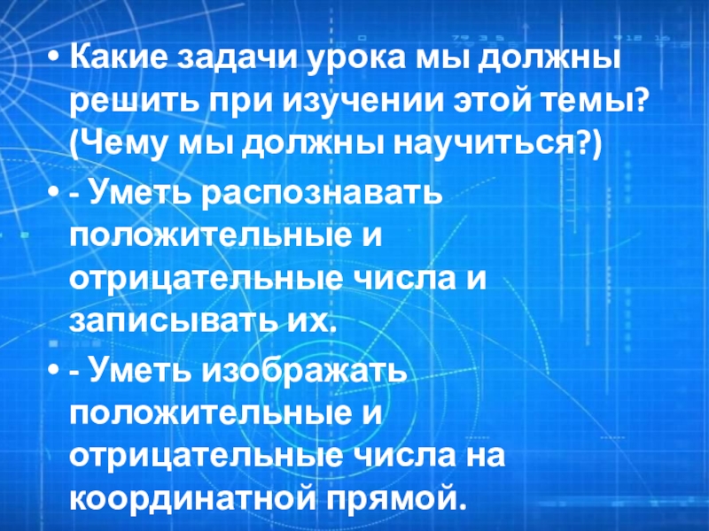 - Уметь изображать положительные и отрицательные числа на координатной прямой.