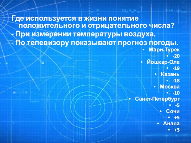 Где используется в жизни понятие положительного и отрицательного числа?- При измерении температуры воздуха.- По телевизору показывают прогноз