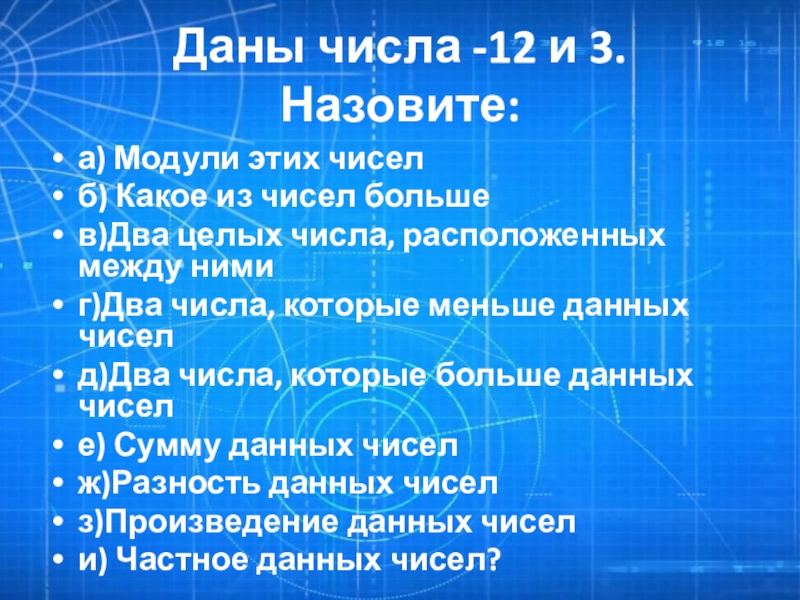 Даны числа -12 и 3. Назовите:а) Модули этих чиселб) Какое из чисел большев)Два целых числа, расположенных между