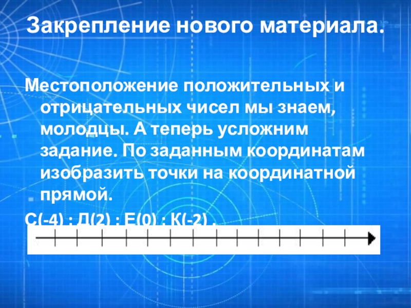 Закрепление нового материала. Местоположение положительных и отрицательных чисел мы знаем, молодцы. А теперь усложним задание. По заданным