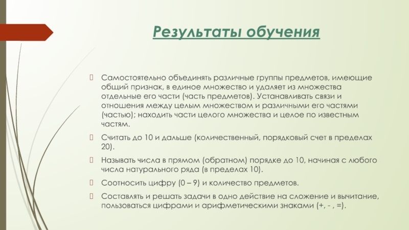 каждой частью на основе счета, составления пар предметов и соединения предметов стрелками.
