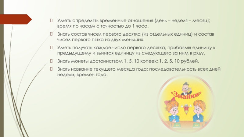 Знать состав чисел первого десятка (из отдельных единиц) и состав чисел первого пятка из двух меньших.