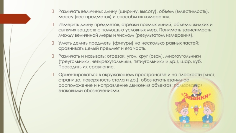 Измерять длину, ширину, высоту предметов (сантиметры, метры, километры, объем жидких и сыпучих веществ с помощью условной меры (литр) .
