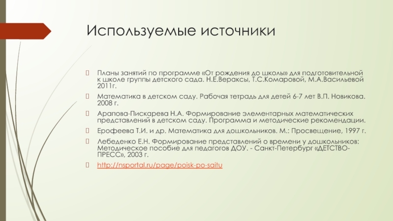 Лебеденко Е.Н. Формирование представлений о времени у дошкольников: Методическое пособие для педагогов ДОУ. - Санкт-Петербург «ДЕТСТВО-ПРЕСС», 2003 г.