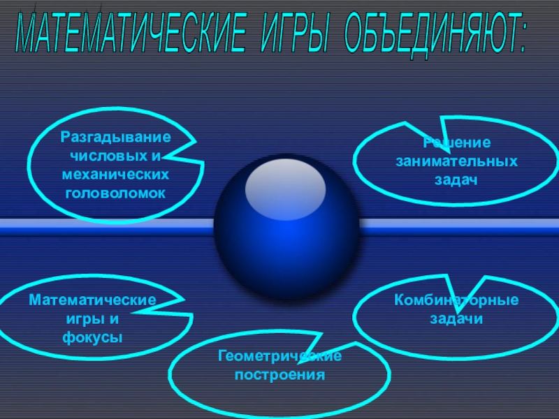 МАТЕМАТИЧЕСКИЕ ИГРЫ ОБЪЕДИНЯЮТ:Разгадывание числовых и механических головоломокРешениезанимательных задачГеометрические построенияМатематическиеигры ифокусыКомбинаторныезадачи