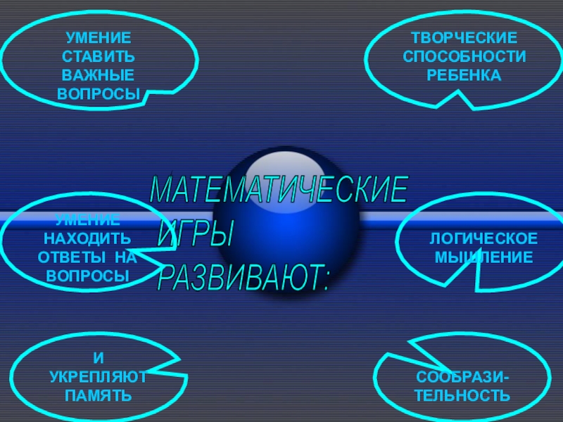 МАТЕМАТИЧЕСКИЕ   ИГРЫ   РАЗВИВАЮТ:ЛОГИЧЕСКОЕМЫШЛЕНИЕСООБРАЗИ-ТЕЛЬНОСТЬТВОРЧЕСКИЕСПОСОБНОСТИРЕБЕНКАИ УКРЕПЛЯЮТПАМЯТЬУМЕНИЕНАХОДИТЬОТВЕТЫ НАВОПРОСЫУМЕНИЕСТАВИТЬВАЖНЫЕ ВОПРОСЫ