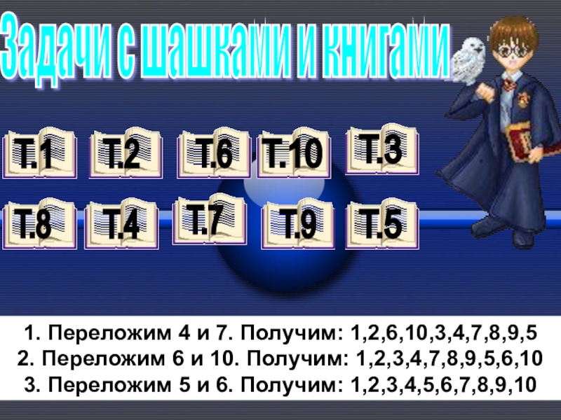 Т.1Т.2Т.6Т.10Т.4Т.7Т.9Т.5Т.3Т.8Задачи с шашками и книгами 1. Переложим 4 и 7. Получим: 1,2,6,10,3,4,7,8,9,52. Переложим 6 и 10. Получим:
