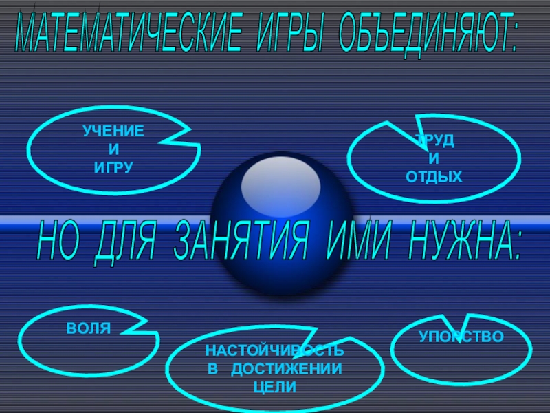 МАТЕМАТИЧЕСКИЕ ИГРЫ ОБЪЕДИНЯЮТ:НО ДЛЯ ЗАНЯТИЯ ИМИ НУЖНА:УЧЕНИЕИИГРУТРУДИОТДЫХНАСТОЙЧИВОСТЬВ  ДОСТИЖЕНИИЦЕЛИВОЛЯУПОРСТВО
