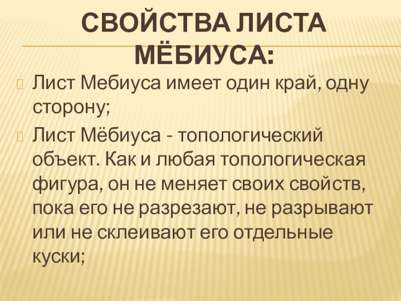 топологический объект. Как и любая топологическая фигура, он не меняет своих свойств, пока его не разрезают, не разрывают или не склеивают его отдельные куски;