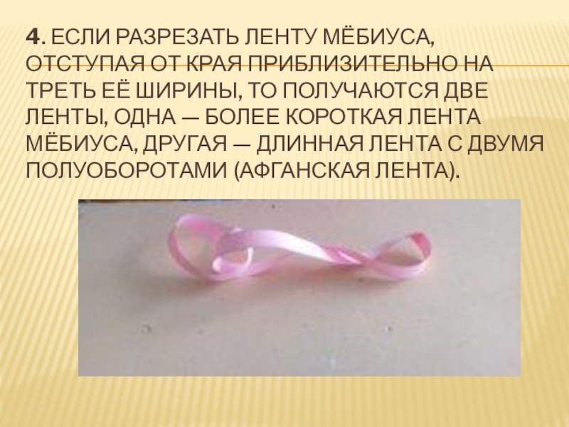 её ширины, то получаются две ленты, одна — более короткая лента Мёбиуса, другая — длинная лента с двумя полуоборотами (Афганская лента).