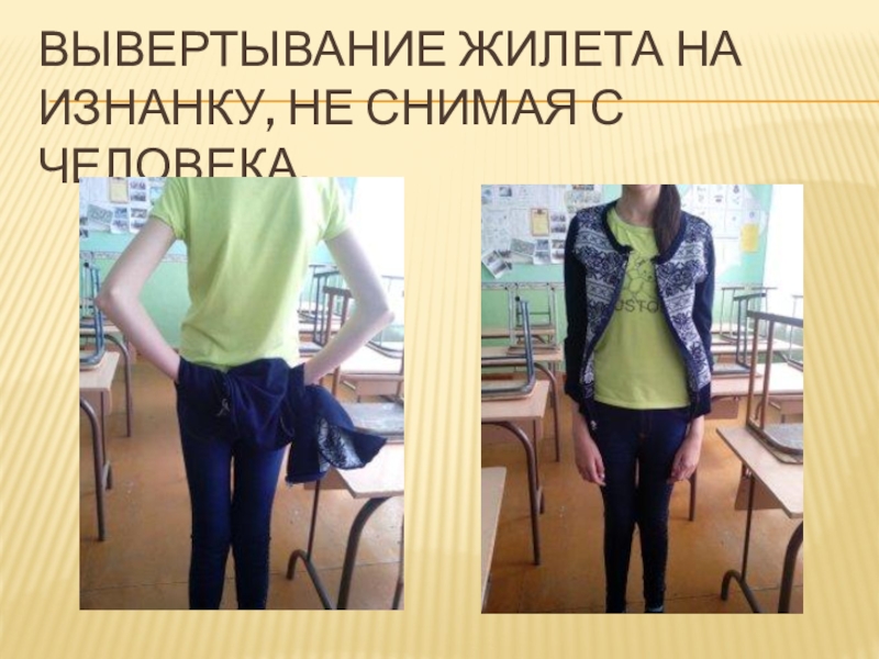 Слайд 25Вывертывание жилета на изнанку, не снимая с человека.
