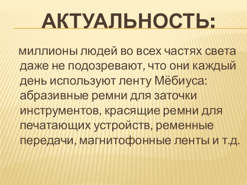 что они каждый день используют ленту Мёбиуса: абразивные ремни для заточки инструментов, красящие ремни для печатающих устройств, ременные передачи, магнитофонные ленты и т.д.