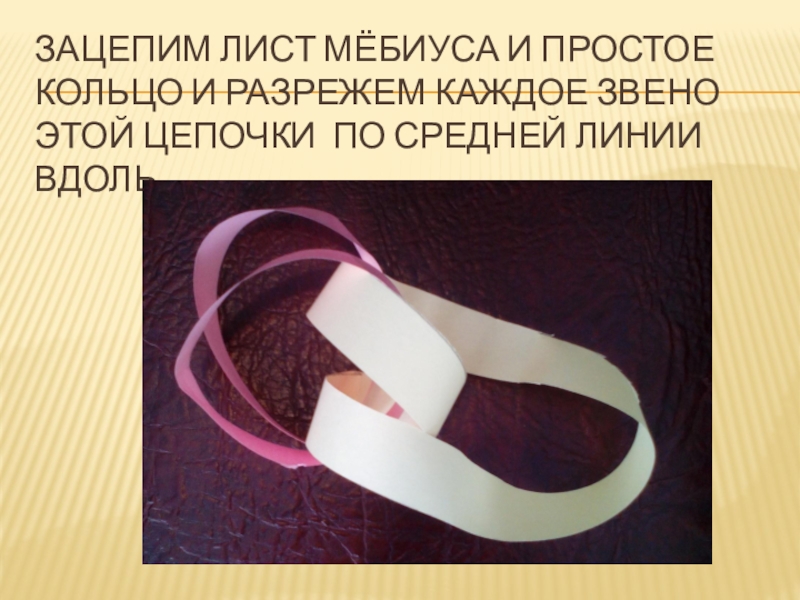 Слайд 21Зацепим лист Мёбиуса и простое кольцо и разрежем каждое звено этой