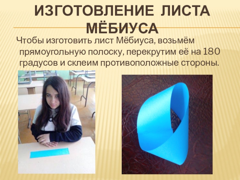 Чтобы изготовить лист Мёбиуса, возьмём прямоугольную полоску,