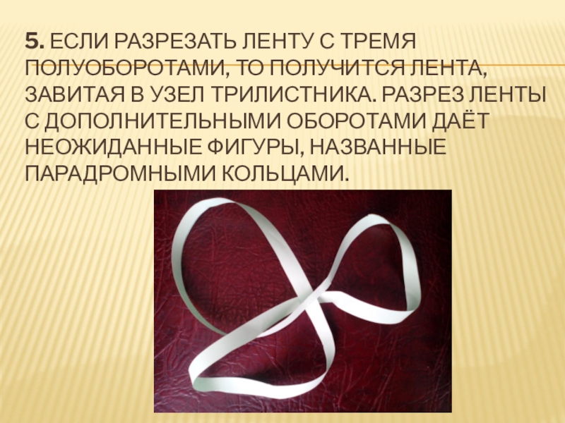 в узел трилистника. Разрез ленты с дополнительными оборотами даёт неожиданные фигуры, названные парадромными кольцами.
