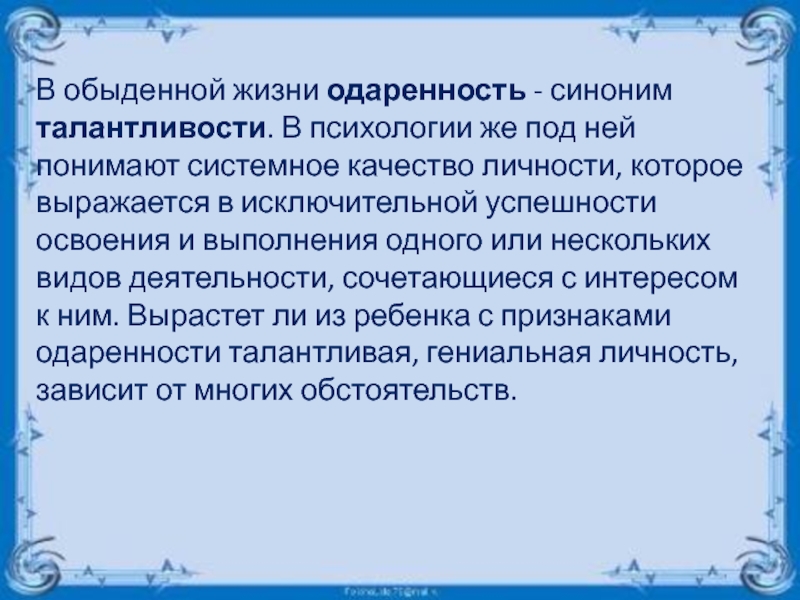 Слайд 7В обыденной жизни одаренность - синоним талантливости. В психологии же под